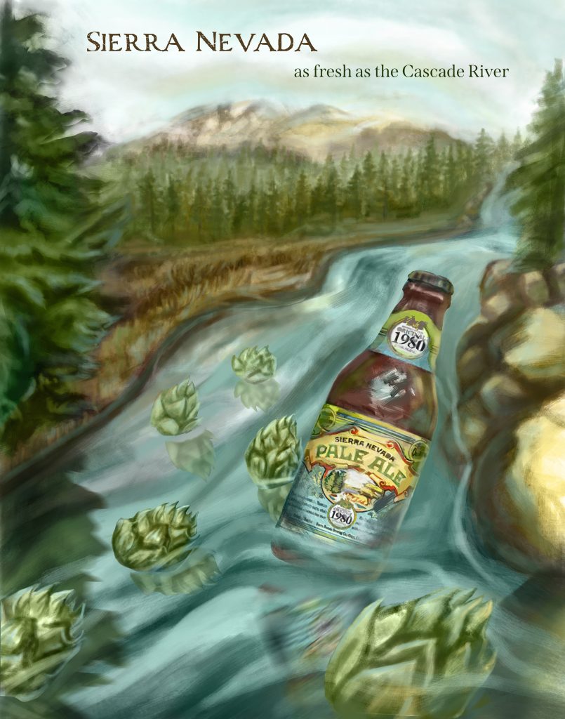 A magazine advertisement illustrated for Sierra Nevada’s returning 1980 misprint label featuring a color pallet in the same colors.